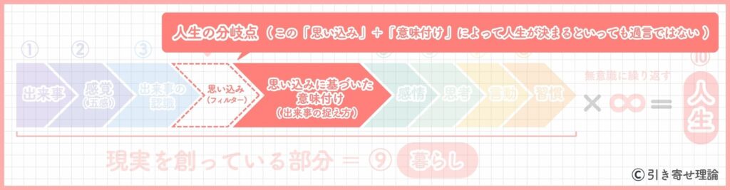 今後の人生の分岐点となり、大きな影響を与えるこの「 ④意味付け ( 捉え方 )」ですが、これはあなたの【 フィルター ( 思い込み ) 】によって決まります。
