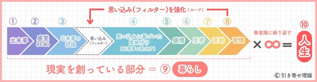 - 現実 ( =人生 )は「 ①出来事 → ②感覚 → ③認識 →【フィルター】→ ④意味付け ( 捉え方 ) → ⑤感情 → ⑥思考 → ⑦言動 → ⑧習慣 = ⑨暮らし × ∞ = ⑩人生 」という無意識の連鎖によって創られている